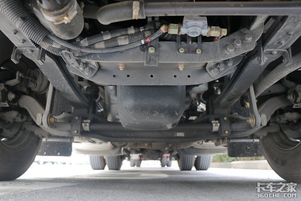 这款车采用153加强康迈前桥,FS160康迈后桥,后桥速比3.083,采用前少片簧后空气的悬架形式,鞍座高度为1130mm,比主流竞品低70mm,长轴距3800mm,对比进口车来说,容积同比扩大3%。